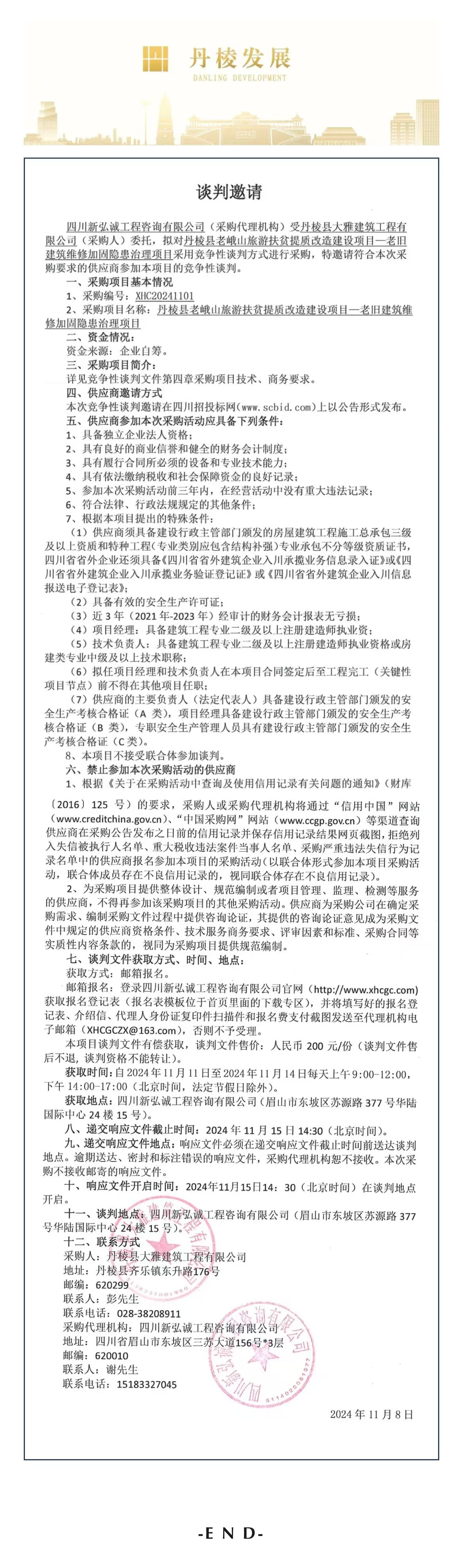 丹棱縣老峨山旅游扶貧提質(zhì)改造建設(shè)項(xiàng)目——老舊建筑維修加固隱患治理項(xiàng)目談判邀請(qǐng)公告