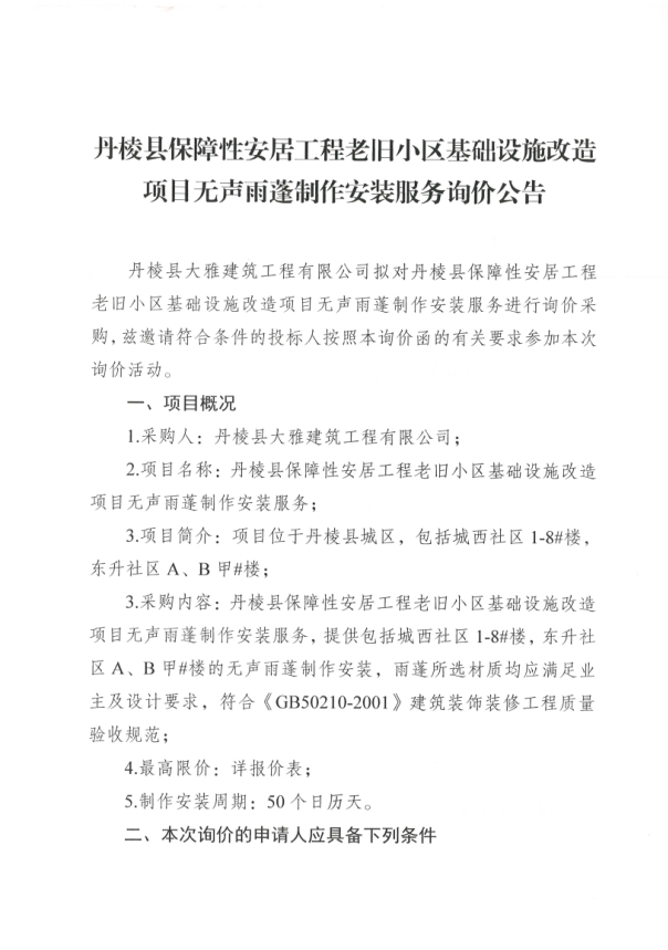 【大雅建筑公司】丹棱縣保障性安居工程老舊小區(qū)基礎(chǔ)設(shè)施改造項(xiàng)目無聲雨蓬制作安裝服務(wù)詢價(jià)公告