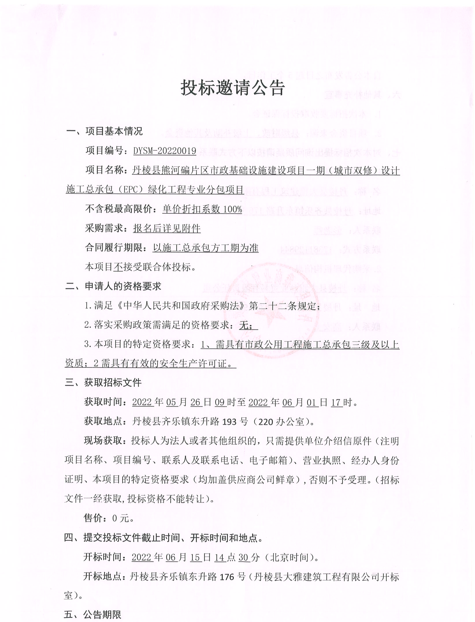 丹棱縣熊河碥片區(qū)市政基礎(chǔ)設(shè)施建設(shè)項目一期(城市雙修)設(shè)計施工總承包(EPC)綠化工程專業(yè)分包項目投標(biāo)邀請公告