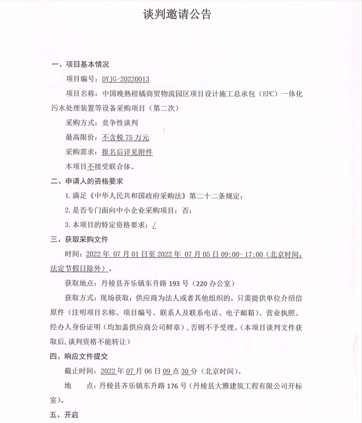 中國晚熟柑橘商貿(mào)物流園區(qū)項(xiàng)目設(shè)計施工總承包(EPC)一體化污水處理裝置等設(shè)備采購項(xiàng)目第二次談判邀請公告