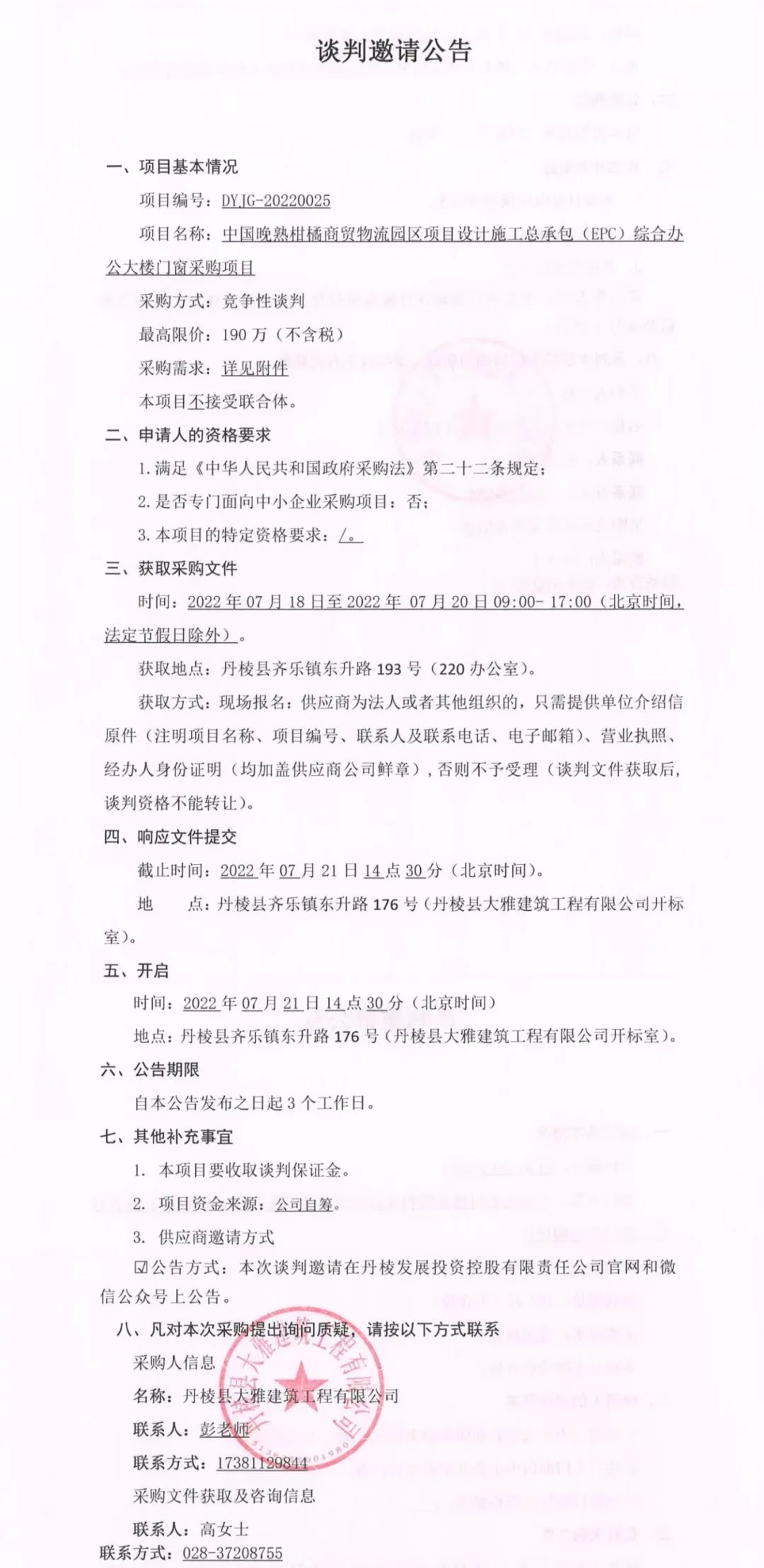 中國(guó)晚熟柑橘商貿(mào)物流園區(qū)項(xiàng)目設(shè)計(jì)施工總承包(EPC)綜合辦公大樓門窗采購(gòu)項(xiàng)目談判邀請(qǐng)公告