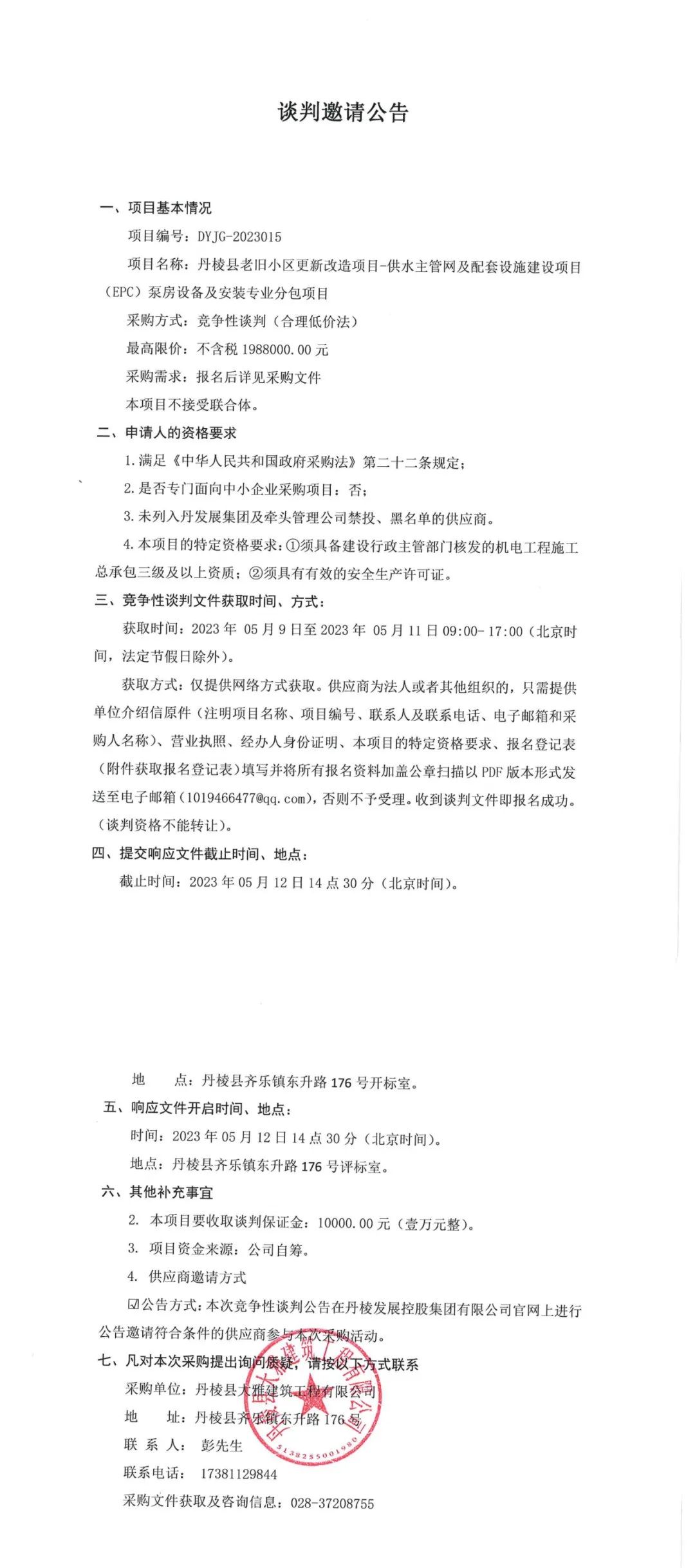 丹棱縣老舊小區(qū)更新改造項(xiàng)目-供水主管網(wǎng)及配套設(shè)施建設(shè)項(xiàng)目(EPC)泵房設(shè)備及安裝專業(yè)分包項(xiàng)目談判邀請(qǐng)公告