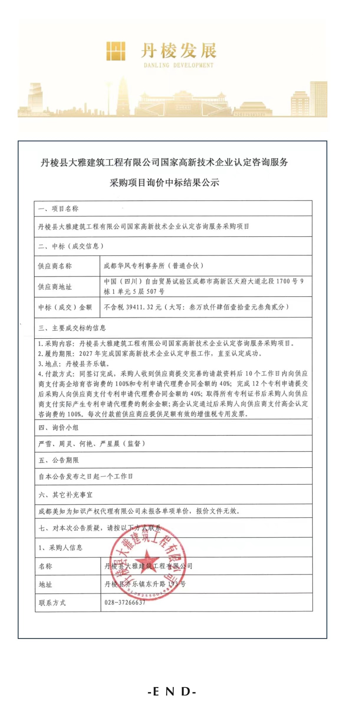 丹棱縣大雅建筑工程有限公司國家高新技術(shù)企業(yè)認(rèn)定咨詢服務(wù)采購項(xiàng)目詢價(jià)中標(biāo)結(jié)果公示