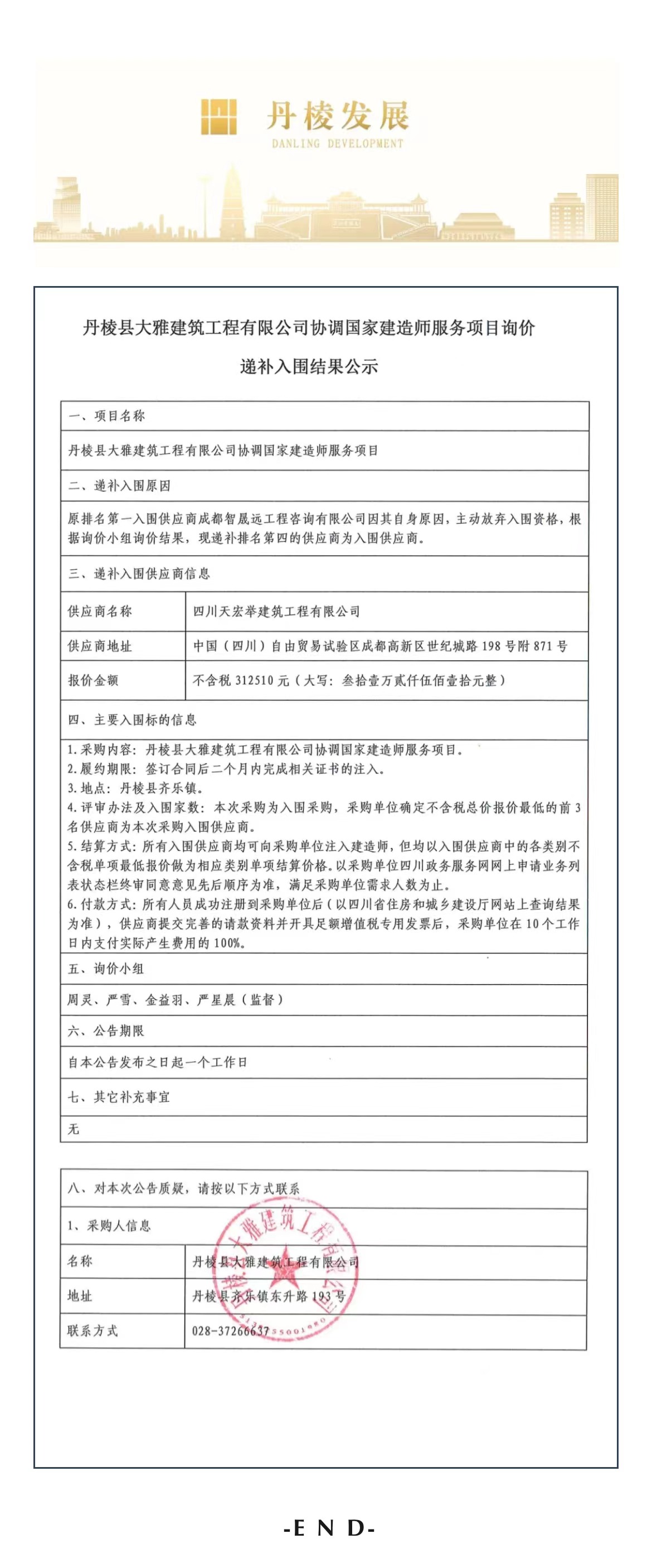 丹棱縣大雅建筑工程有限公司協(xié)調(diào)國家建造師服務(wù)項(xiàng)目詢價(jià)遞補(bǔ)入圍結(jié)果公示