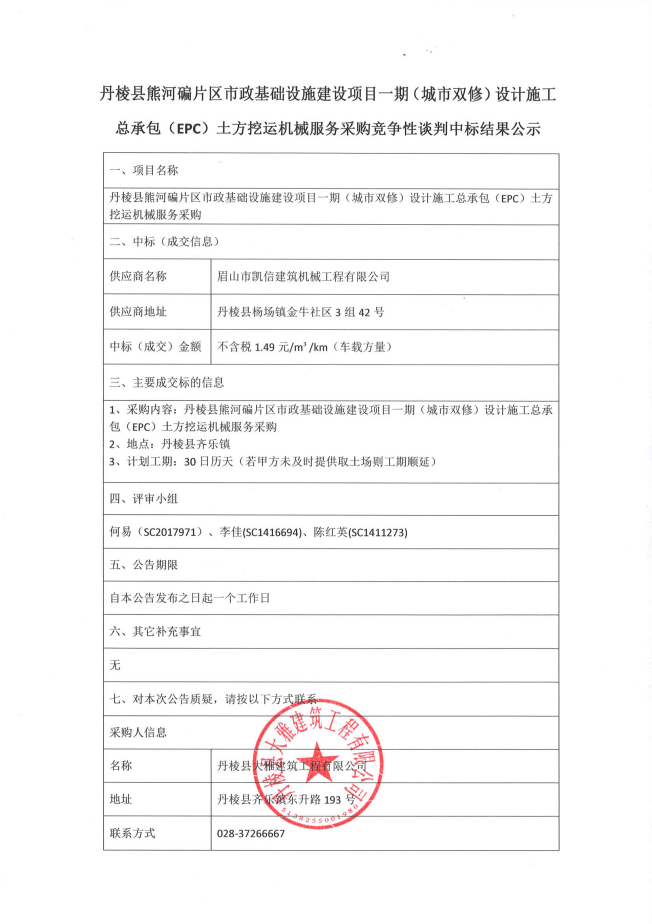 丹棱縣熊河碥片區(qū)市政基礎(chǔ)設(shè)施建設(shè)項(xiàng)目一期(城市雙修)設(shè)計(jì)施工 總承包(EPC)土方挖運(yùn)機(jī)械服務(wù)采購(gòu)競(jìng)爭(zhēng)性談判中標(biāo)結(jié)果公示