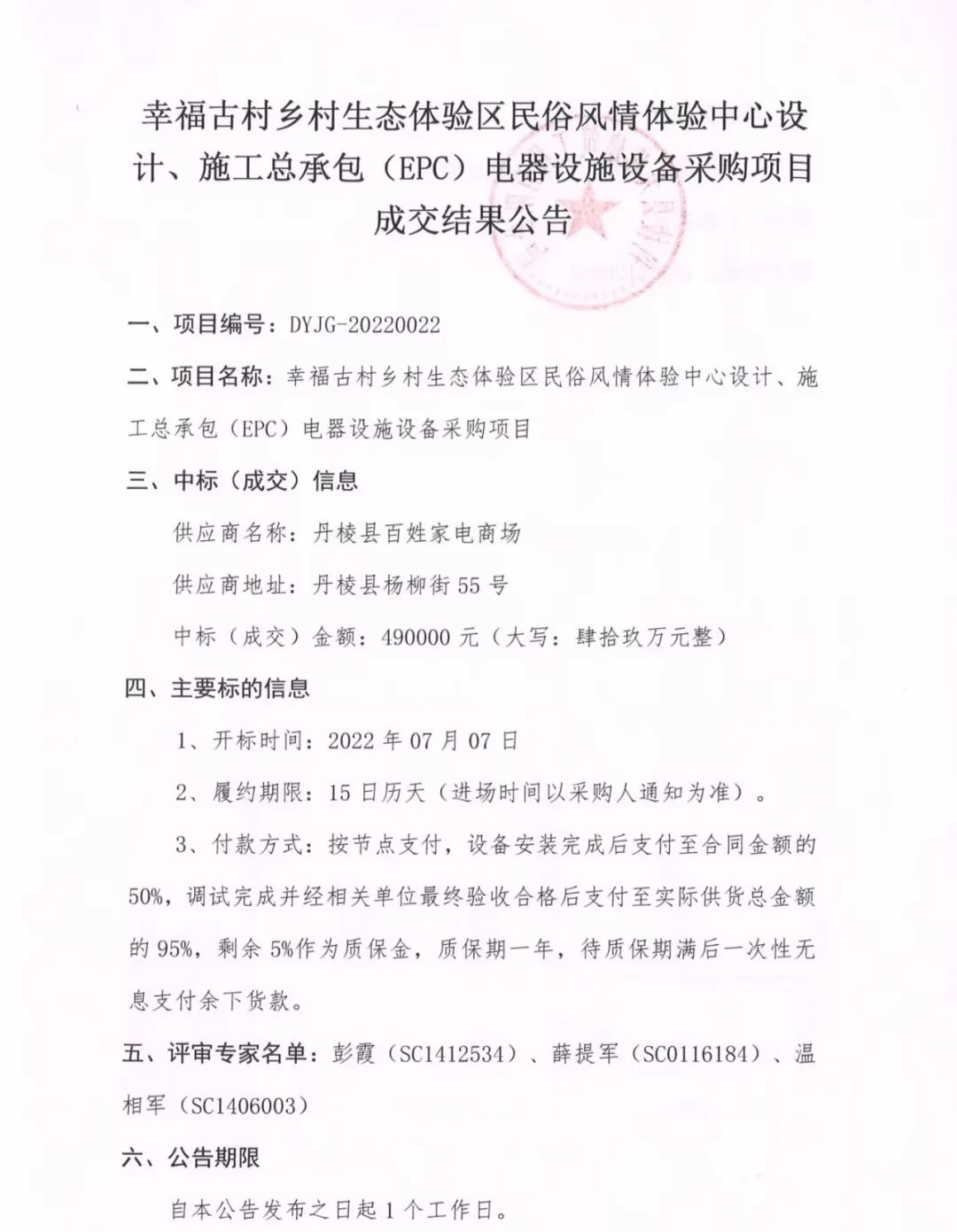 幸福古村鄉(xiāng)村生態(tài)體驗區(qū)民俗風(fēng)情體驗中心設(shè)計、施工總承包(EPC)電器設(shè)施設(shè)備采購項目成交結(jié)果公告