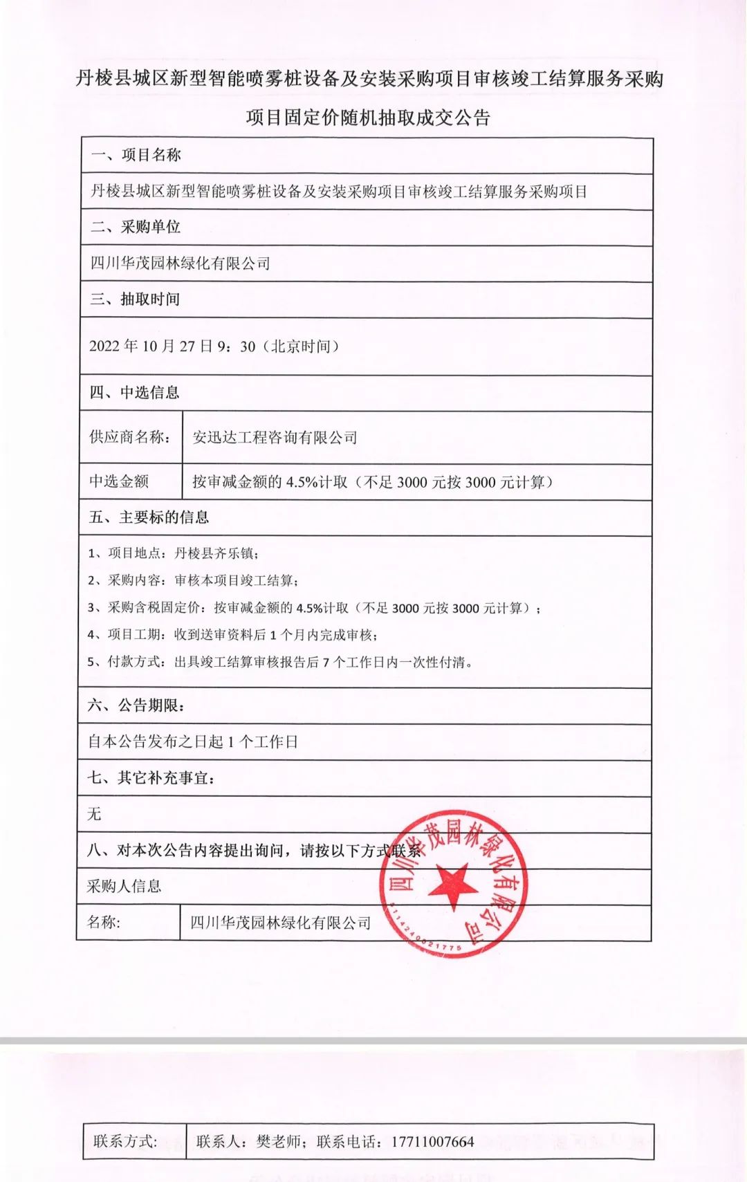 丹棱縣城區(qū)新型智能噴霧樁設(shè)備及安裝采購項目審核竣工結(jié)算服務(wù)采購項目固定價隨機抽取成交公告