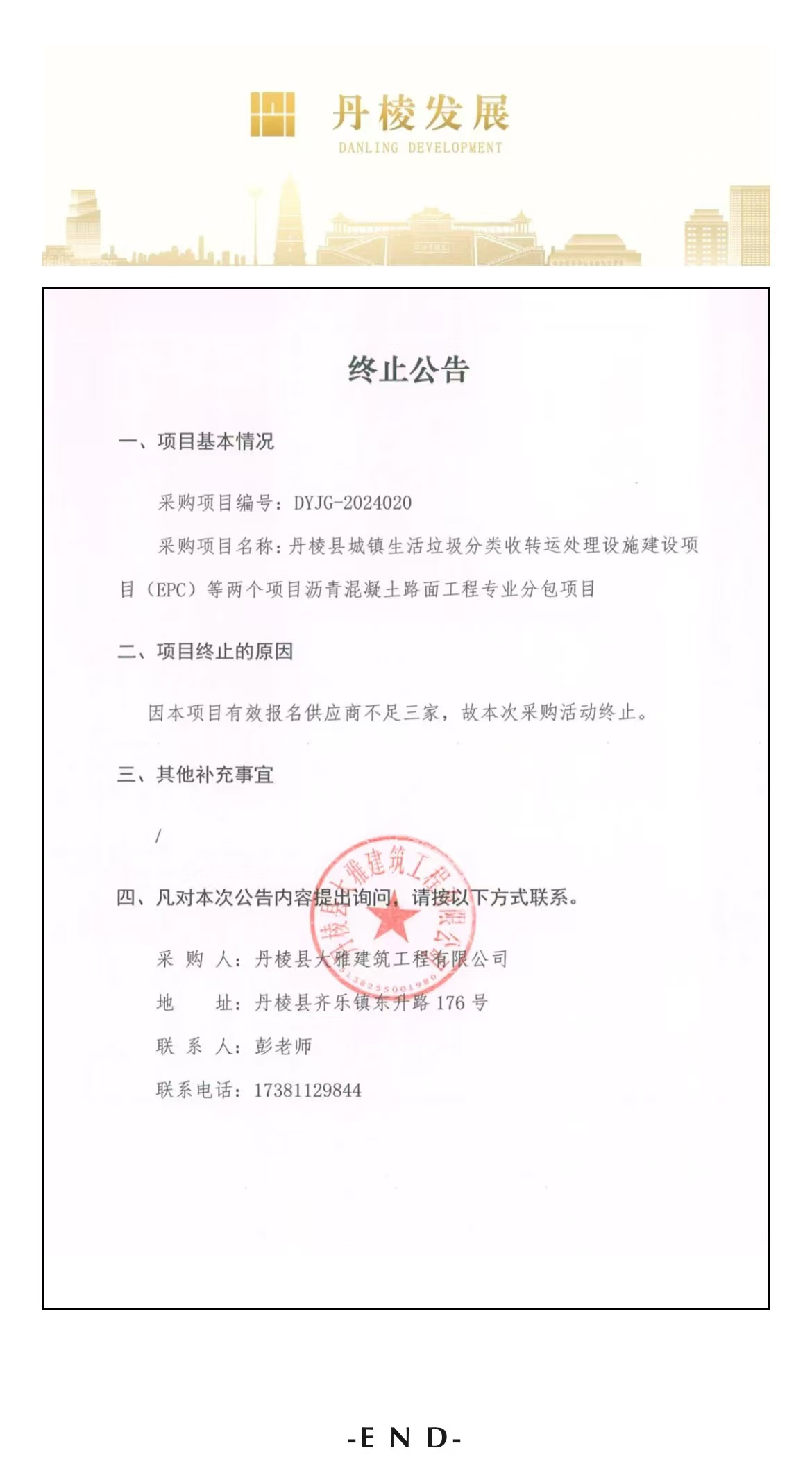 丹棱縣城鎮(zhèn)生活垃圾分類(lèi)收轉(zhuǎn)運(yùn)處理設(shè)施建設(shè)項(xiàng)目(EPC)等兩個(gè)項(xiàng)目瀝青混凝土路面工程專(zhuān)業(yè)分包項(xiàng)目終止公告