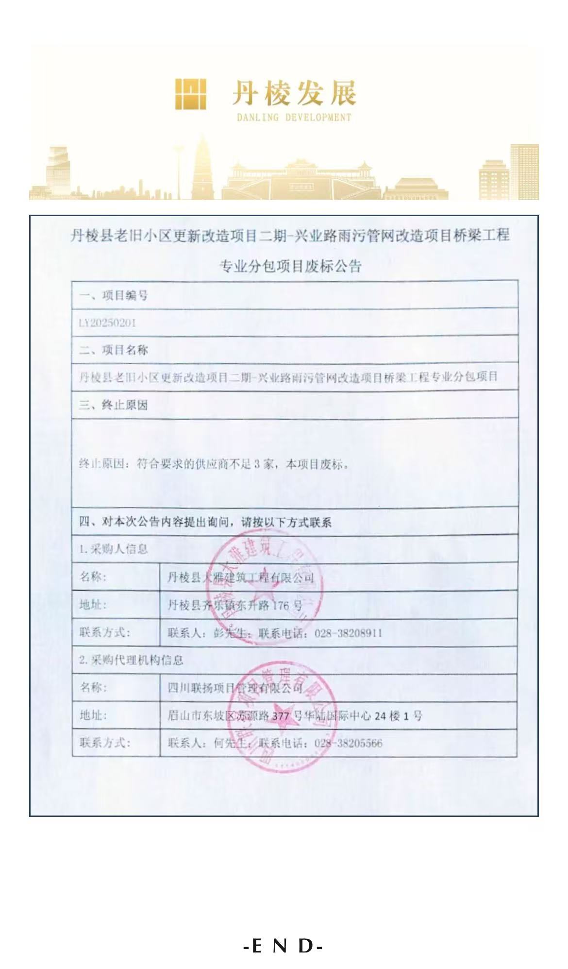 丹棱縣老舊小區(qū)更新改造項目二期-興業(yè)路雨污管網(wǎng)改造項目橋梁工程專業(yè)分包項目廢標公告