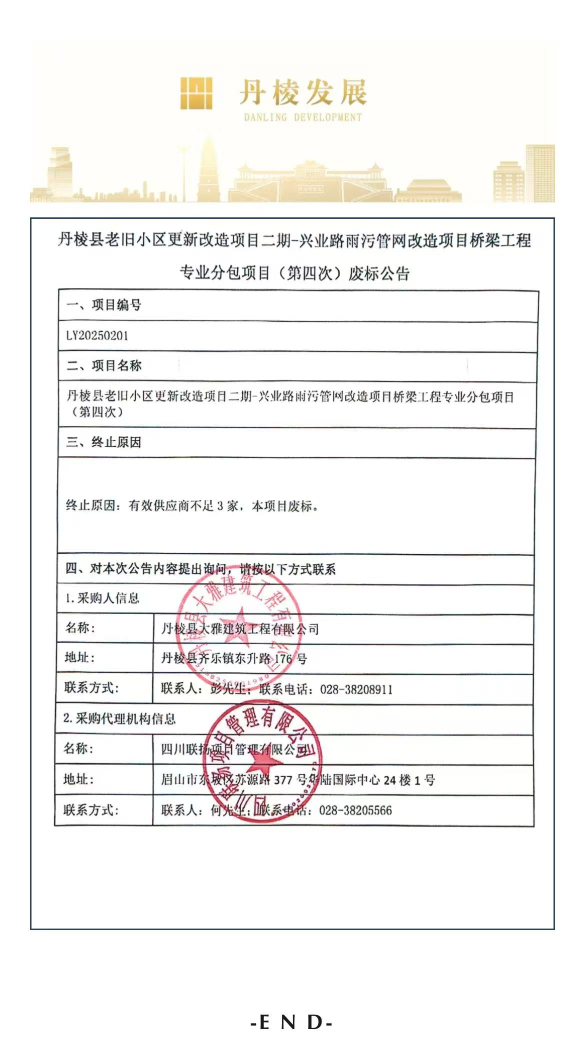 丹棱縣老舊小區(qū)更新改造項(xiàng)目二期-興業(yè)路雨污管網(wǎng)改造項(xiàng)目橋梁工程專業(yè)分包項(xiàng)目(第四次)廢標(biāo)公告