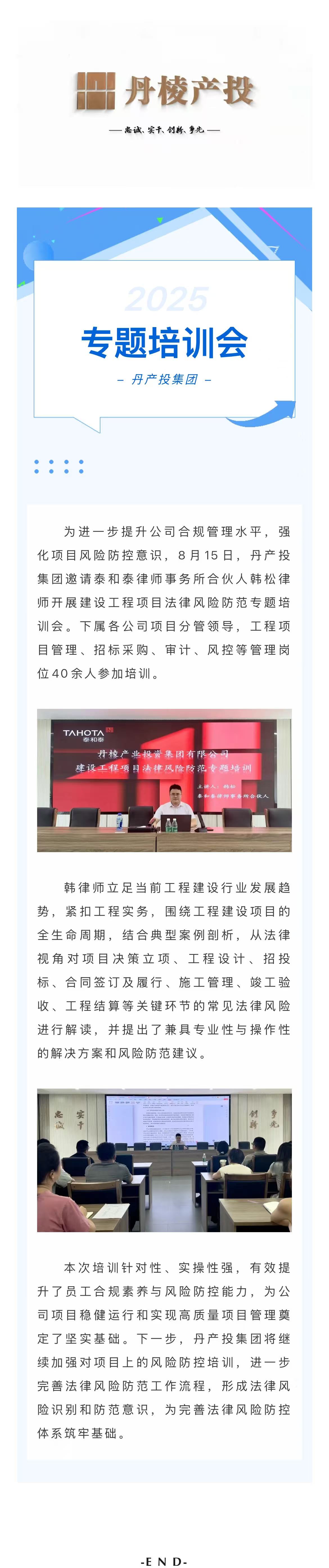 丹產(chǎn)投集團(tuán)開展建設(shè)工程項目法律風(fēng)險防范專題培訓(xùn)會